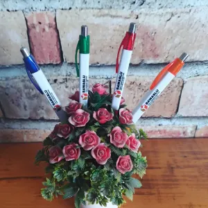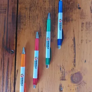 The product, named Bawaslu Branded Pens, is a set of four promotional click pens. Each pen features the official Bawaslu logo and comes in a distinct color: orange, red, blue, and green. These pens are perfect for use in official events, public campaigns, and as promotional giveaways to raise awareness for the organization's mission.
