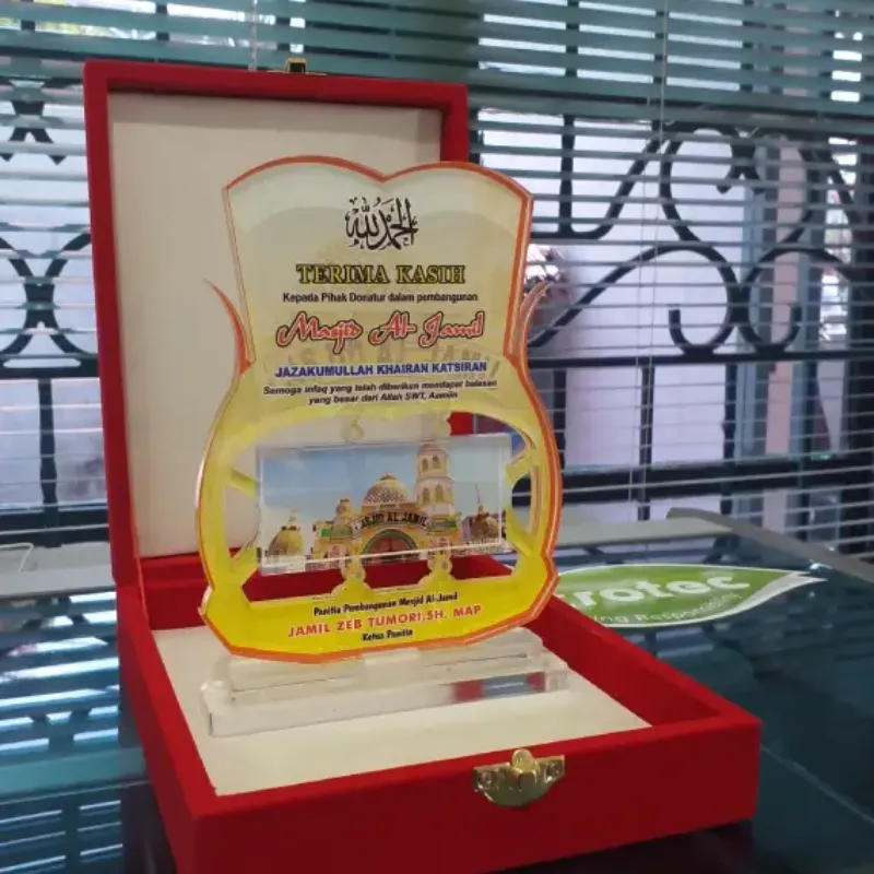 This unique and deeply meaningful acrylic plaque serves as a formal token of Gratitude and Thanks for a religious contribution. It is presented by the Masjid Al-Jamil Development Committee to the donors who contributed to the construction of the mosque. The design features an artistic, full-color 3D-like depiction of the Al-Jamil Mosque embedded within the clear acrylic, framed by a distinctive yellow and red curved border. The text expresses thanks, includes a calligraphy of Basmalah, and the prayer "Jazakumullah Khairan Katsiran". This beautiful keepsake is presented within a luxurious red velvet box, ensuring a respectful, exclusive, and professional presentation suitable for religious acknowledgement.