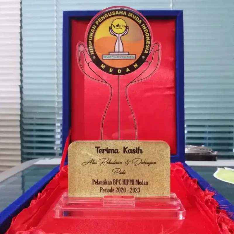 This highly distinctive acrylic plaque serves as a formal token of Gratitude and Thanks for attendance and support. The unique design features an oversized graphic of two hands cradling a stylized award trophy, representing support and recognition for the Himpunan Pengusaha Muda Indonesia (HIPMI) Medan. The accompanying text acknowledges the recipient's presence and support for the Inauguration of the BPC HIPMI Medan (2020-2023 Period). The plaque's graphic is rendered in full color, while the base text panel utilizes a classic, textured background. This impressive keepsake is beautifully presented within a luxurious dark blue and red velvet/satin box, making it an exclusive item for major organizational events.