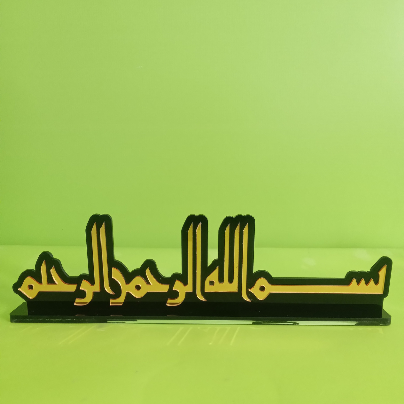 A beautifully crafted Islamic table decor featuring the elegant “Bismillah” calligraphy, designed to enhance any room with a spiritual and artistic touch. This layered acrylic piece brings a modern aesthetic while maintaining traditional calligraphy style, making it perfect for home interiors, office desks, gifts, or display decorations. Its striking contrast and polished finish create a premium look that stands out in any setting.
