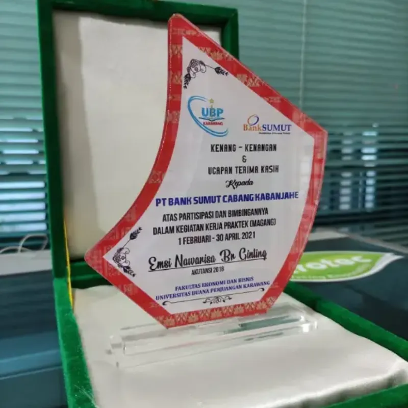 "This customized appreciation plaque is a symbol of gratitude and recognition presented by Universitas Buana Perjuangan Karawang to PT Bank Sumut Kabanjahe Branch. Crafted from premium acrylic with a unique hexagonal design, it features a red border motif and detailed printed text to honor participation and guidance during an internship program. The plaque is securely placed in an elegant green velvet box, making it a meaningful token of appreciation."