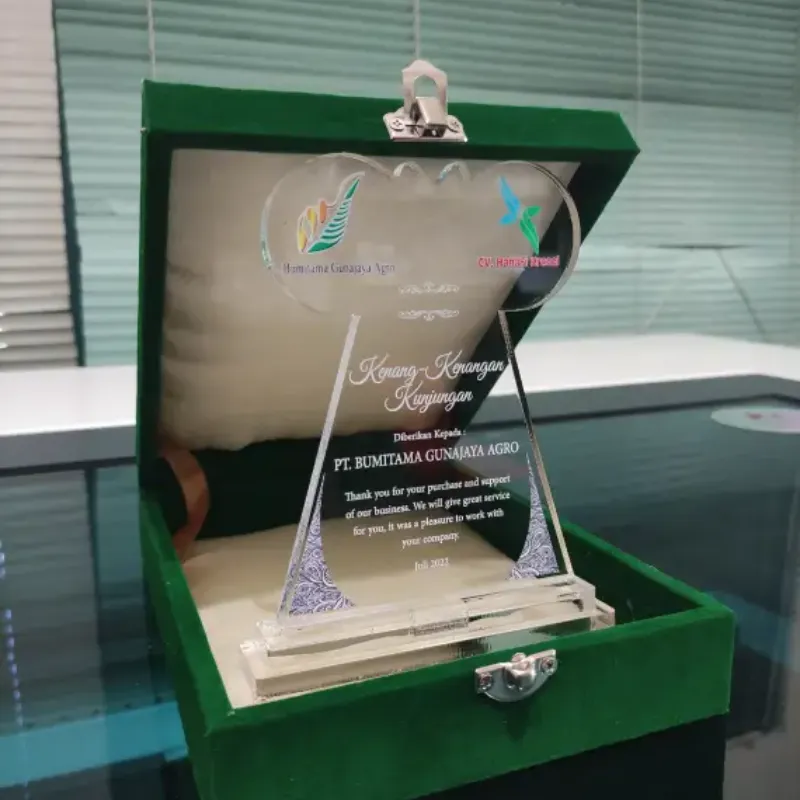 This is a detailed product description based on the image of the acrylic recognition plaque presented in a green velvet storage box.