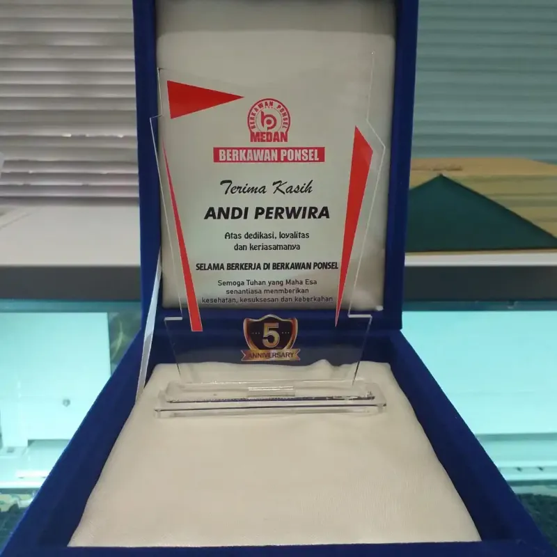 "This elegant acrylic plaque is designed as a token of appreciation for dedication, loyalty, and teamwork. Featuring a sleek transparent body with vibrant printed details, it commemorates the 5th Anniversary of Berkawan Ponsel Medan. Packaged in a premium velvet-lined presentation box, it is perfect for corporate recognition, milestone celebrations, and employee awards."