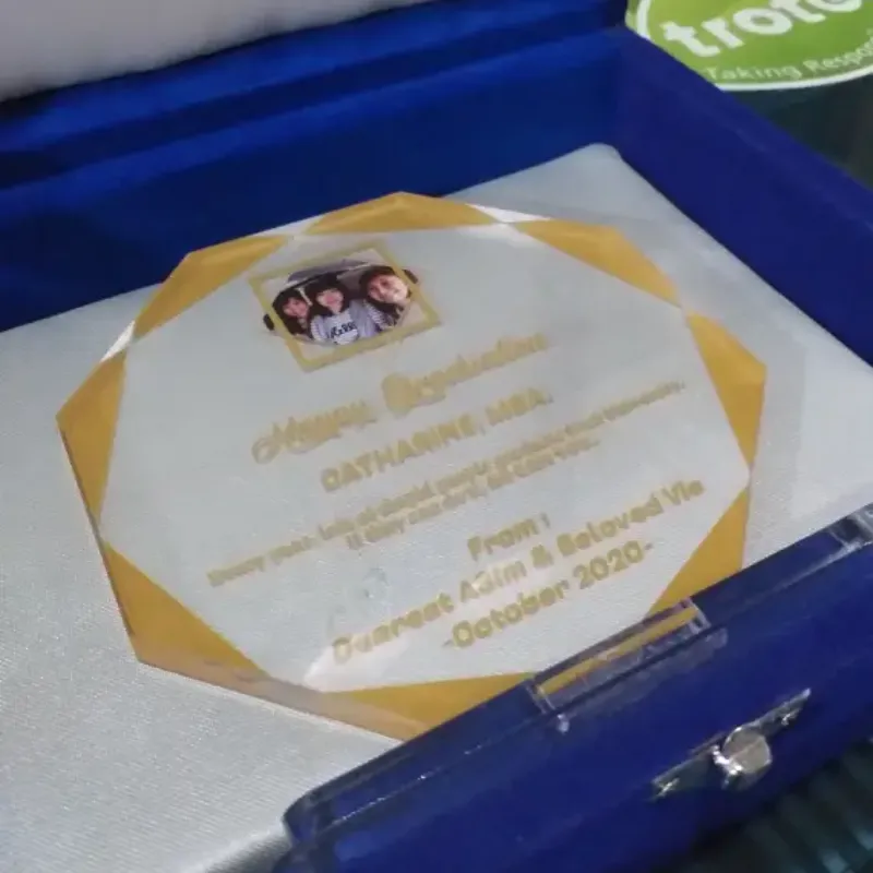 The Premium Octagon Gold Edge Crystal Graduation Plaque is an exclusive and elegant gift to celebrate a significant commencement milestone. Crafted from high-quality K9 crystal, this plaque boasts a diamond-like brilliance and clarity, making it a truly unforgettable keepsake. The striking octagonal shape with a gold-accented border gives it a modern and prestigious look.