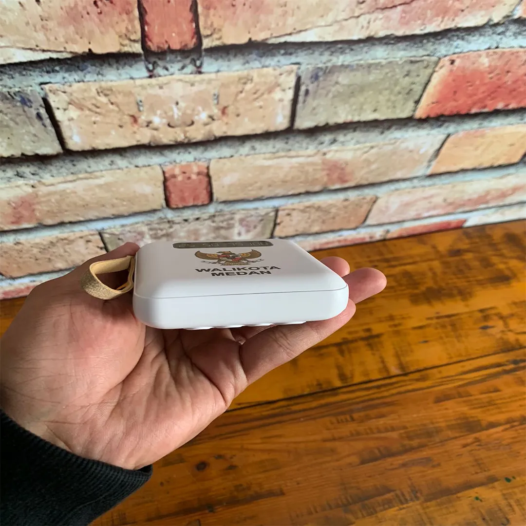 Tampil elegan dan fungsional, power bank ini merupakan produk eksklusif bertanda resmi Walikota Medan. Dibalut dengan desain minimalis berwarna putih, produk ini menampilkan logo Garuda Pancasila yang disesuaikan dengan lambang Kota Medan di bagian depan, serta tulisan "WALIKOTA MEDAN" sebagai identitas. Power bank ini dilengkapi dengan layar digital indikator kapasitas baterai yang menunjukkan level daya pada angka 25, 50, 75, dan 100 persen, memberikan informasi yang jelas tentang sisa daya. Tali samping yang elegan menambah kemudahan saat dibawa bepergian.