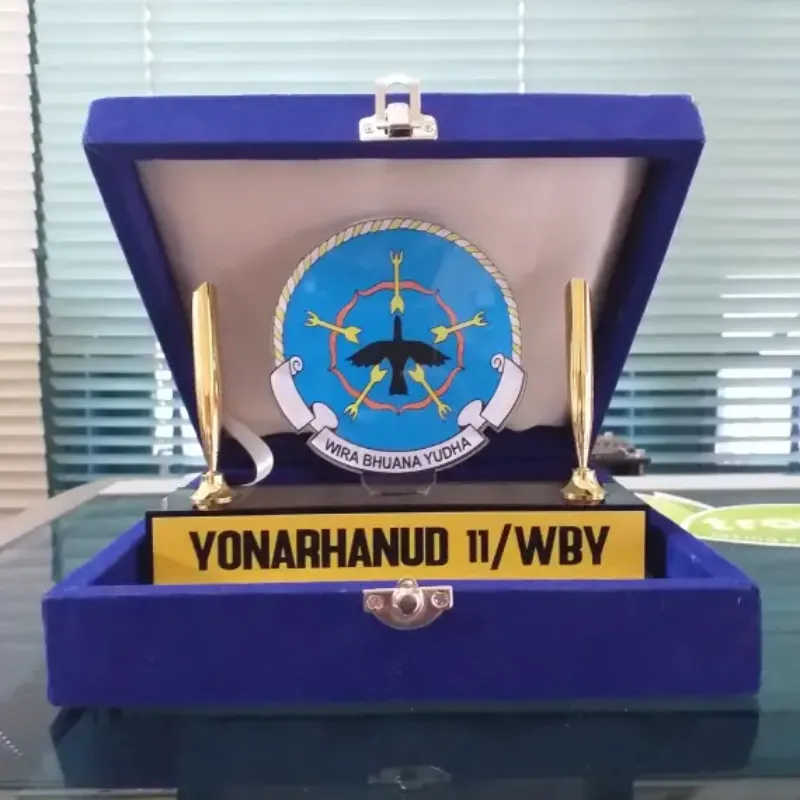 This exclusive military desk nameplate is a premium souvenir designed with an elegant blue velvet box, dual golden pen holders, and the official YONARHANUD 11/WBY emblem. Perfect as a collectible, office decoration, or an appreciation gift for military members and partners. The design reflects prestige and honor, making it suitable for display on desks, offices, or as a memorable keepsake.