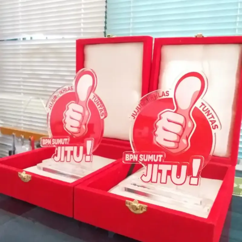 This pair of striking, highly graphic acrylic plaques serves as a motivational award or recognition piece. The design prominently features a large "Thumbs Up" hand gesture in bold red and white, symbolizing approval, excellence, and success. The plaques promote the motto "BPN SUMUT JITU!" (which translates roughly to "North Sumatra BPN is Excellent/Accurate!"). The text includes values such as "IKHLAS - TUNTAS" and "JUJUR - IKHLAS - TUNTAS", indicating an award for integrity, sincerity, and completion of duties. This unique, energetic keepsake is professionally presented side-by-side within two luxurious red velvet boxes, making them perfect for recognizing high-performing individuals or teams within BPN (National Land Agency) North Sumatra.