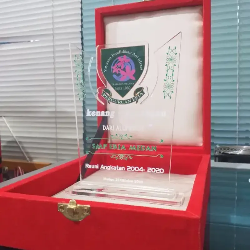 A beautifully designed school reunion acrylic plaque made from premium transparent acrylic with a vibrant school logo and decorative side patterns. Perfect as a souvenir for reunions, alumni gatherings, school anniversaries, or appreciation gifts. Comes with a luxury red velvet box for an elegant presentation.