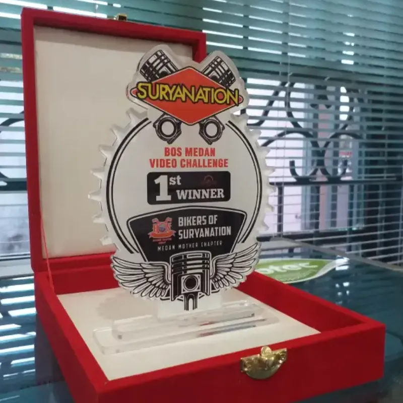 This energetic, custom-shaped acrylic plaque serves as a Championship Award for a competition. The design is highly thematic, celebrating the "BOS Medan Video Challenge" (Bikers of Suryanation) and proclaiming the recipient as the "1st Winner". The artwork is bold and dynamic, featuring gear shapes, pistons, wings, and the SURYANATION branding, perfectly aligning with a motorcycle/biker community event. This premium keepsake is housed within a luxurious red velvet box, providing an exclusive and memorable presentation suitable for recognizing excellence in competitions.