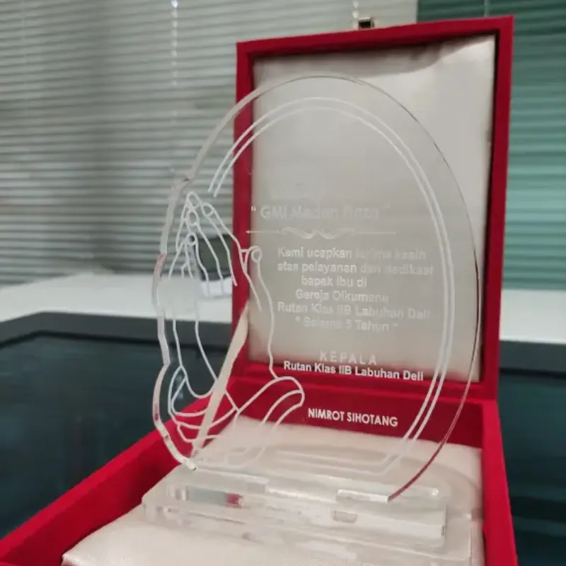 This unique, custom-shaped acrylic plaque serves as a heartfelt token of Gratitude and Appreciation. The design features a distinctive outline of a hand holding an oval frame, symbolizing support, dedication, and service. It is presented by the Head of Rutan Kelas IIB Labuhan Deli (Nimrot Sihotang) to an individual at Gereja Oikumene Rutan Kelas IIB Labuhan Deli, acknowledging their service and dedication for 5 years. The details are crisply laser-engraved onto the clear acrylic. This personal and meaningful keepsake is beautifully presented within a luxurious red velvet box, ensuring an exclusive and professional presentation suitable for commemorating long-term service.