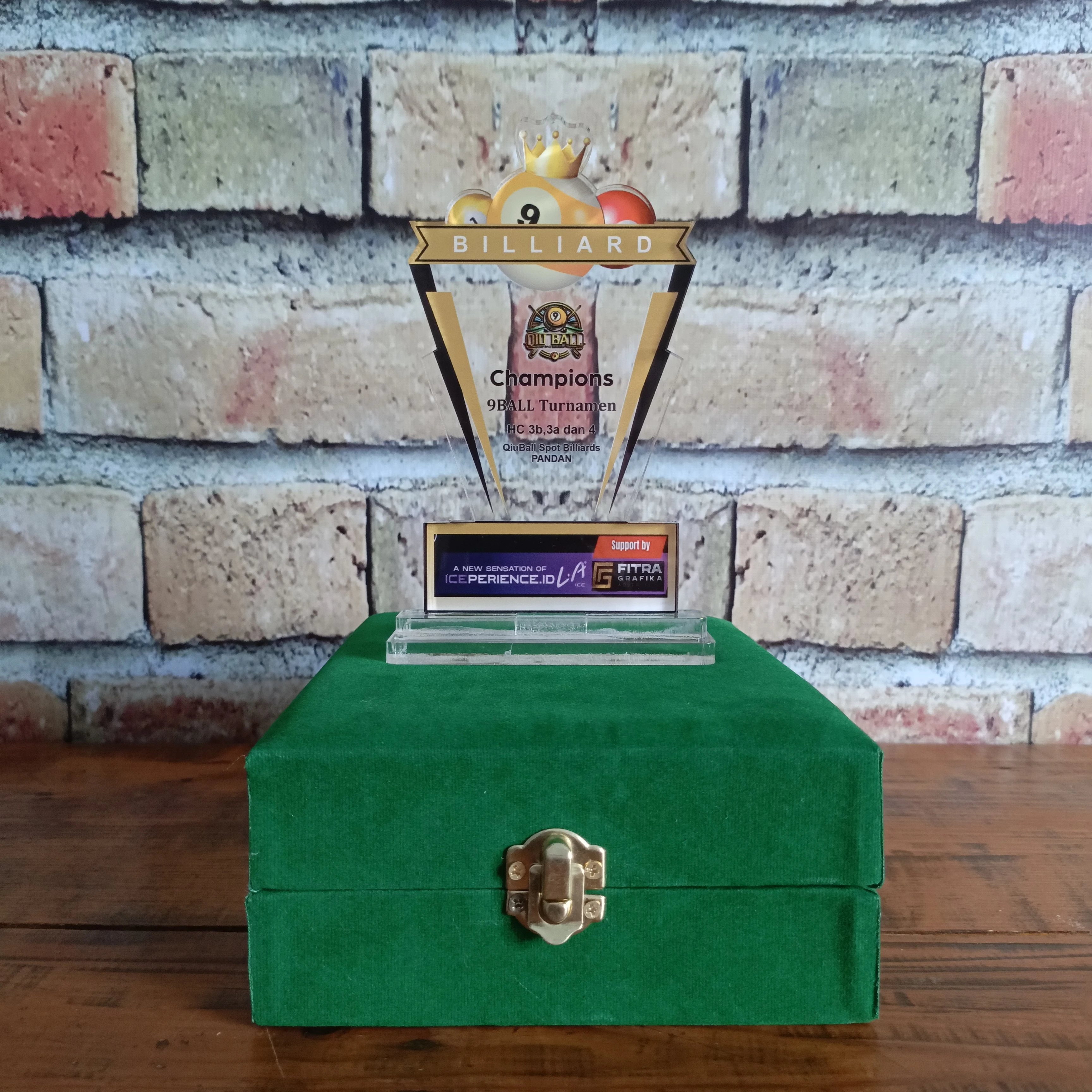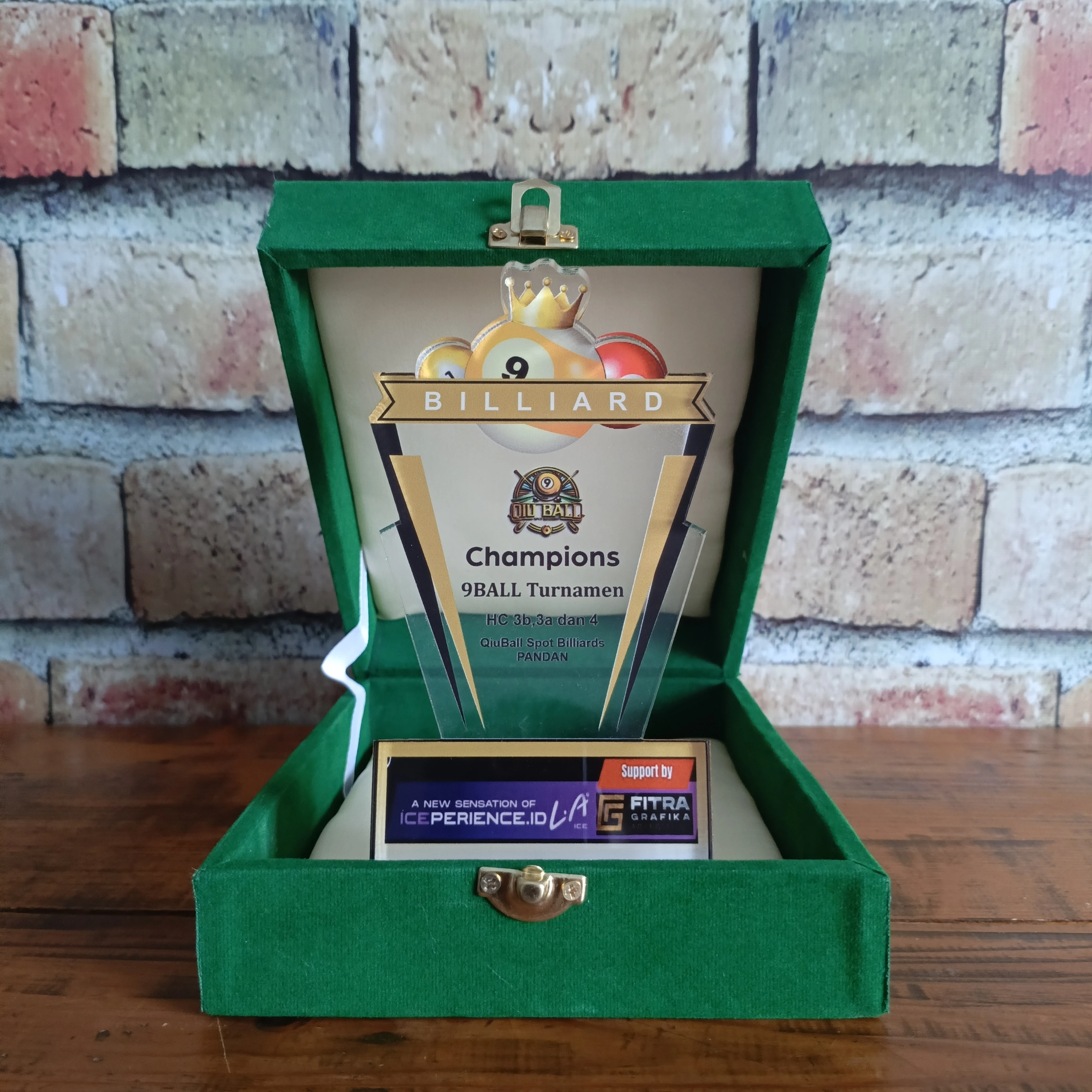 This exclusive plaque is a trophy award for the 9 Ball billiard tournament championship, specially designed as a symbol of achievement and pride for the champions. Made of high-quality acrylic material with an elegant shield-shaped design, this plaque features the iconic 9 billiard ball graphic and a crown as a symbol of victory. This plaque is packed in a green velvet box with a soft interior that adds a luxurious and professional impression. Perfect for sports tournament awards, especially billiards, and can be used as a valuable souvenir by the winners.
