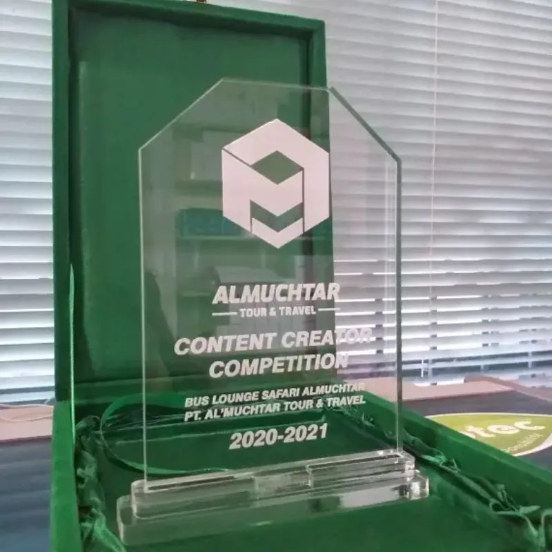 This modern, pentagon-shaped acrylic plaque serves as a prestigious Championship Award or trophy. It is presented for the Content Creator Competition organized by PT. Al’Muchtar Tour & Travel and their Bus Lounge Safari Al’Muchtar for the 2020-2021 period. The design is sleek, featuring a bold, angular corporate logo that is sharply etched or printed onto the clear acrylic. The overall clean aesthetic perfectly suits a creative competition. This premium trophy is elegantly packaged within a luxurious dark green velvet box, ensuring an exclusive and memorable presentation suitable for corporate recognition and competition winners.