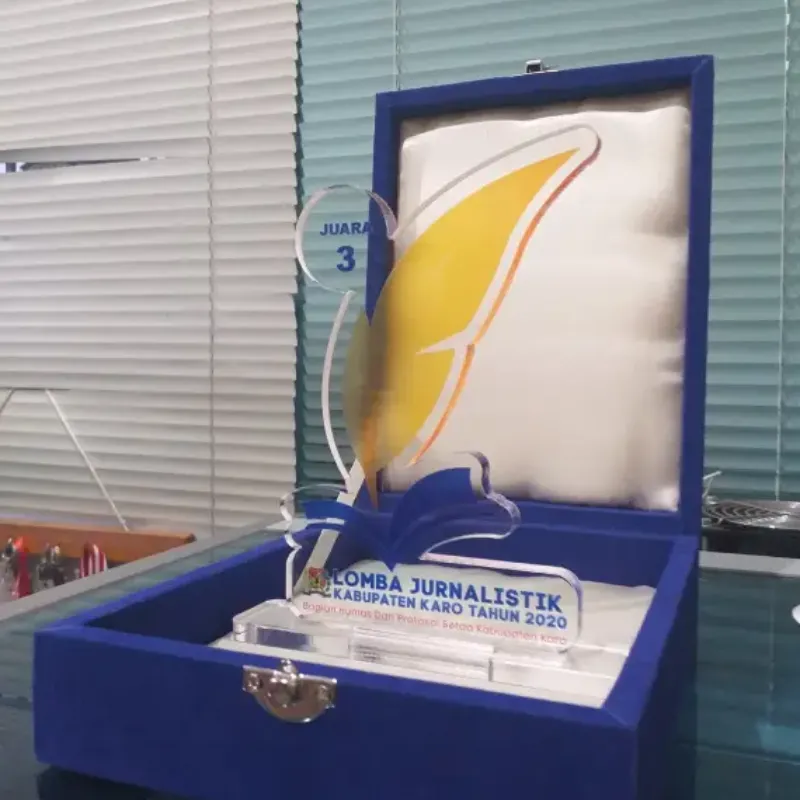 "This exclusive acrylic plaque was awarded to the 3rd place winner of the 2020 Journalism Competition in Karo Regency. Designed with a transparent body and a bold golden feather motif, it symbolizes creativity, expression, and journalistic excellence. Packaged in a premium blue velvet box, the plaque serves as a meaningful recognition for achievement and dedication in journalism."