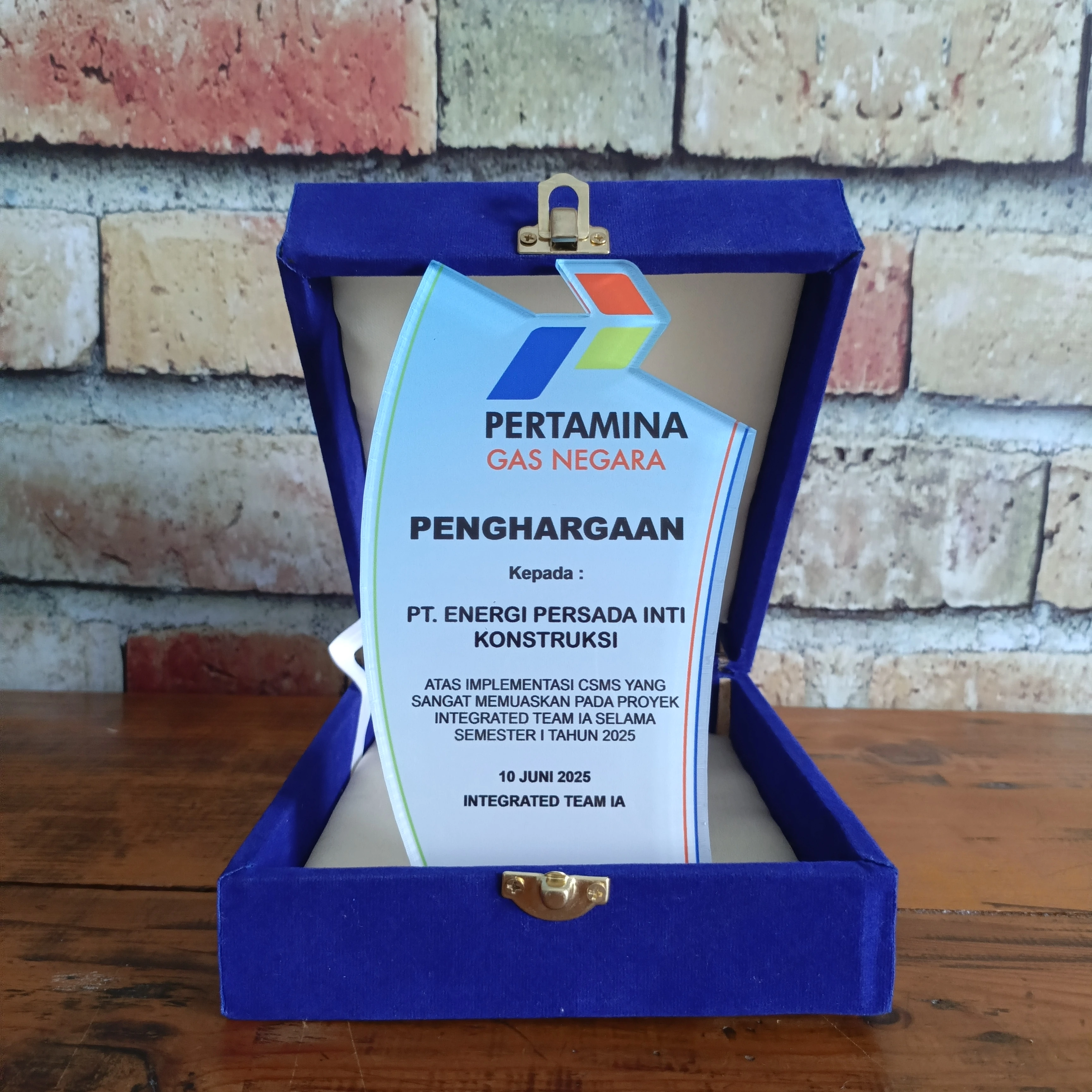 Premium clear acrylic plaque with elegant and modern design, given by Pertamina Gas Negara as a form of appreciation for its partners. This plaque has a unique shape resembling wings or flames that symbolize passion and innovation. The Pertamina colored logo at the top provides a strong corporate identity.