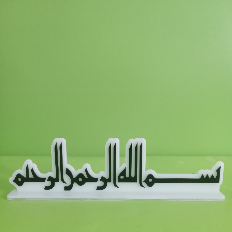 A beautifully crafted Islamic table decor featuring the elegant “Bismillah” calligraphy, designed to enhance any room with a spiritual and artistic touch. This layered acrylic piece brings a modern aesthetic while maintaining traditional calligraphy style, making it perfect for home interiors, office desks, gifts, or display decorations. Its striking contrast and polished finish create a premium look that stands out in any setting.