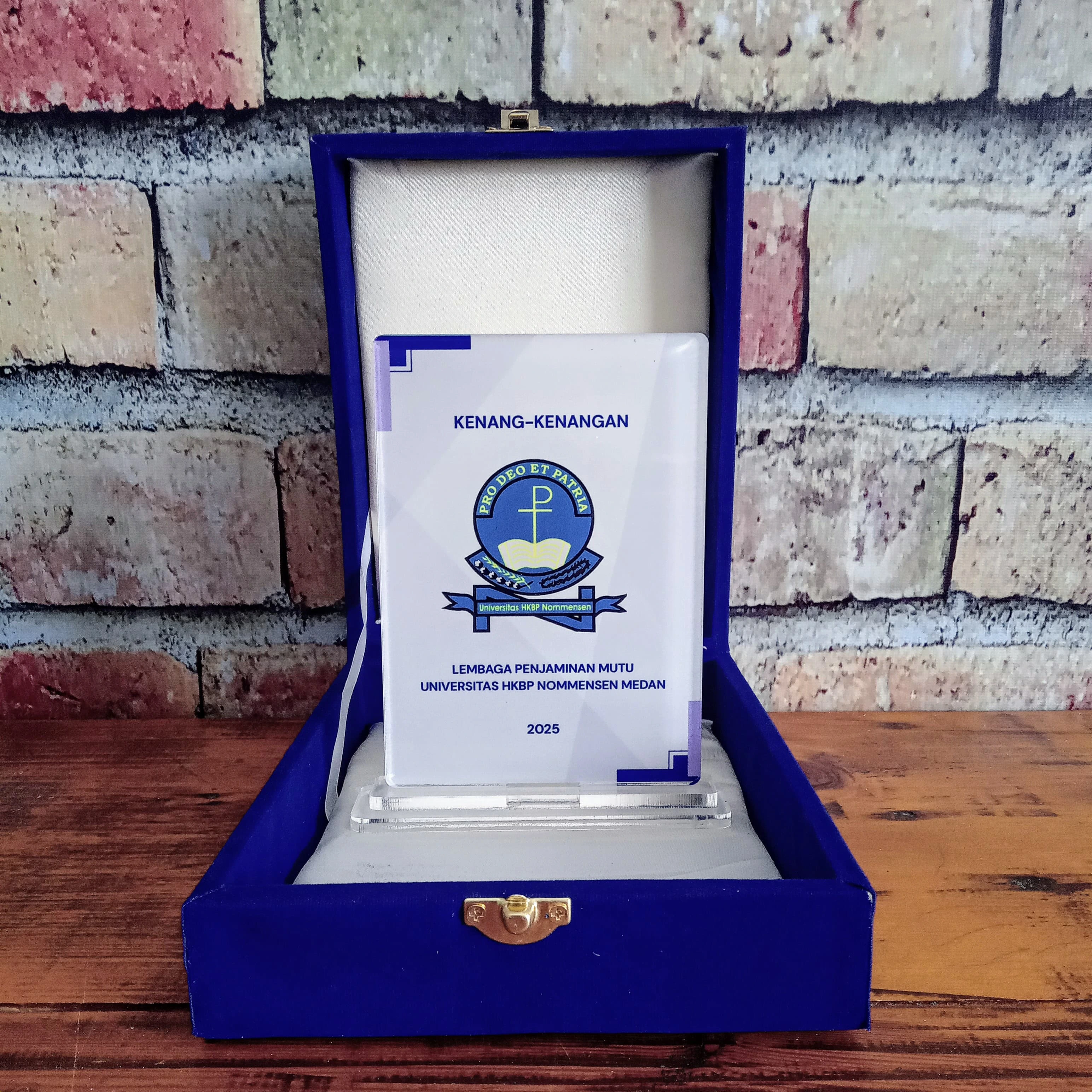 This acrylic plaque is a form of official award and souvenir by the Quality Assurance Institute of HKBP Nommensen University Medan. Elegantly designed in a royal blue velvet box, this plaque displays the institution's logo clearly with a professional finish.