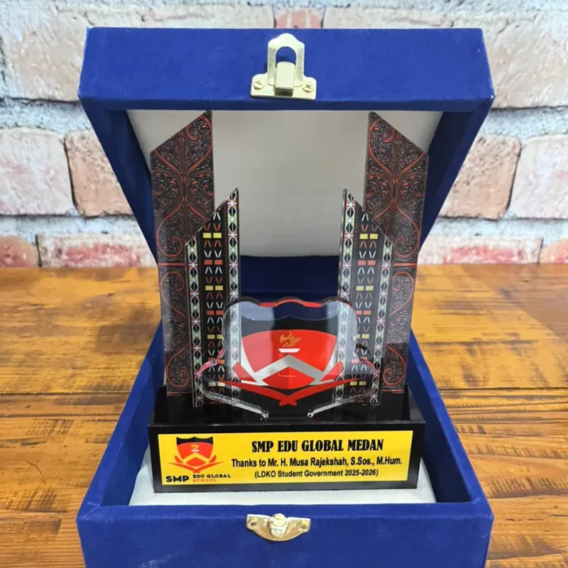 This is a custom acrylic commemorative plaque or trophy presented in a luxurious, hinged, velvet-lined presentation box (likely deep blue or royal blue). It appears to be a formal token of appreciation or recognition, specifically from a student organization in an Indonesian school.