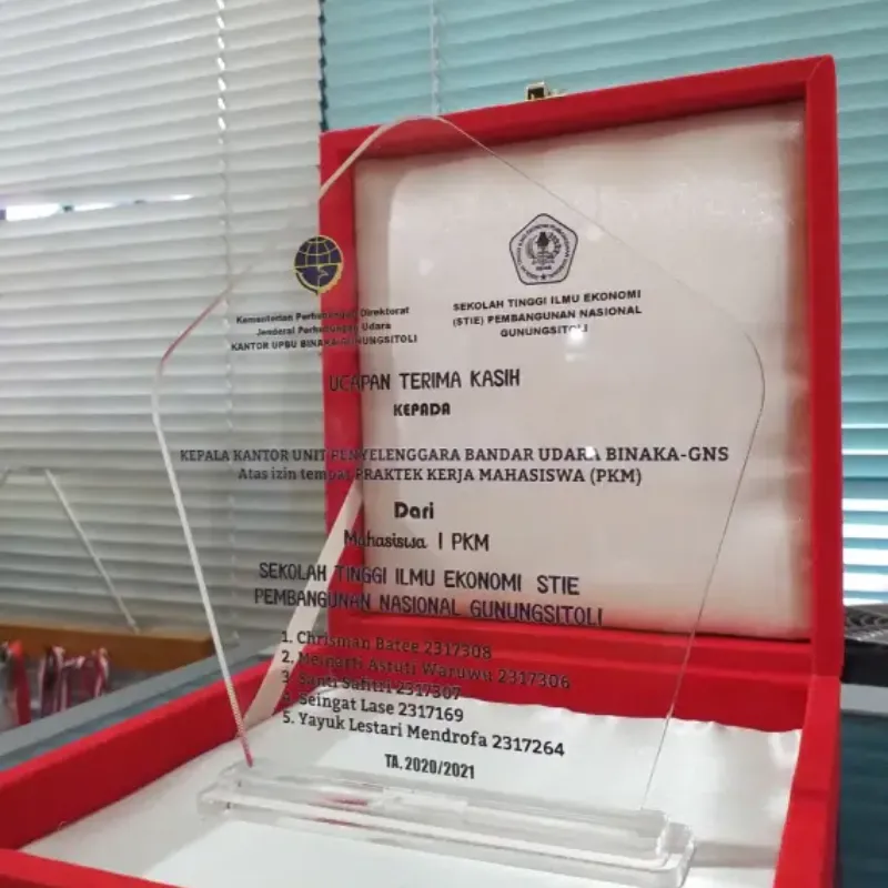 This elegant, custom-shaped acrylic plaque serves as a formal token of Gratitude and Thanks. It is presented by the students of STIE Pembangunan Nasional Gunung Sitoli to the Head of the Binaka Airport Unit (UPBU Binaka) in Gunung Sitoli, under the Directorate General of Civil Aviation, Ministry of Transportation. The plaque acknowledges the permission and opportunity to conduct Student Field Work Practice (PKM). Designed with a unique clear body and both institutional logos, it lists the participating students' names. This premium keepsake is beautifully displayed within a luxurious red velvet box, providing an exclusive and professional presentation.