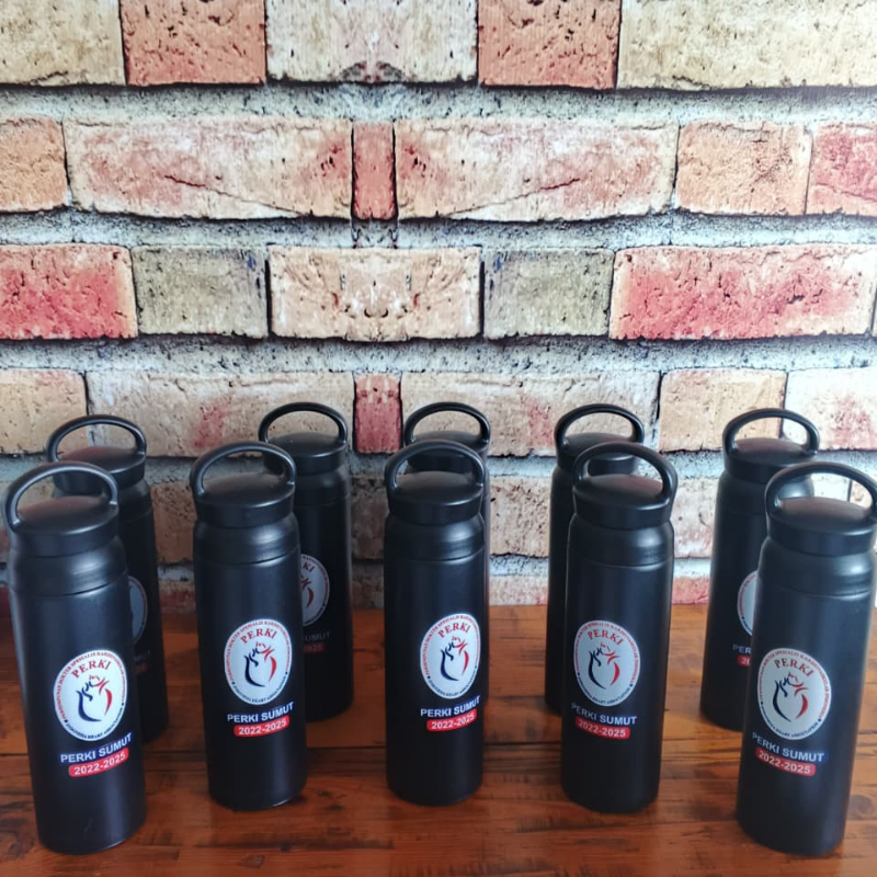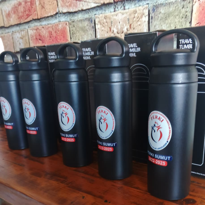 This exclusive 500ml tumbler features an elegant matte black design and the PERKI SUMUT logo. It's perfect for official merchandise, organizational event souvenirs, or practical daily essentials for the office, school, or outdoor activities.