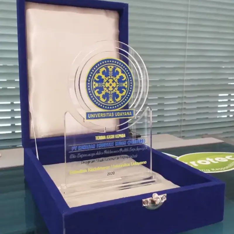 This elegant, custom-shaped acrylic plaque serves as a formal token of Gratitude and Thanks. It is presented by the Health Science Study Program, Udayana University, to PT. Kawasan Industri Medan (PERSERO). The plaque acknowledges the cooperation and opportunity provided for a Field Work Practice (Praktik Kerja Lapangan). The design features a prominent, circular Universitas Udayana logo on the main body. This premium keepsake is beautifully displayed within a luxurious dark blue velvet box, ensuring an exclusive and professional presentation suitable for acknowledging institutional and corporate collaboration.