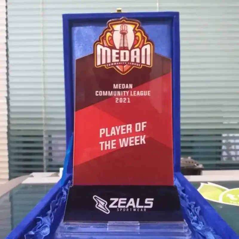 This stylish acrylic trophy was exclusively designed for the Medan Community League 2021, honoring the "Player of the Week." Featuring a bold red gradient background with the league’s logo and modern typography, it symbolizes excellence and recognition for outstanding performance. Packaged in a premium blue velvet box, this award is perfect for sports achievements and weekly recognition events.