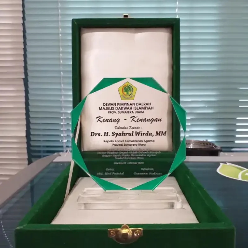This premium crystal award plaque comes in a striking octagon shape with a green border accent, representing strength and honor. It features custom logo printing and detailed engraving, making it an excellent choice for institutions, government bodies, and organizations to show appreciation or recognition. Packaged in a green velvet-lined box, this plaque is both elegant and durable.