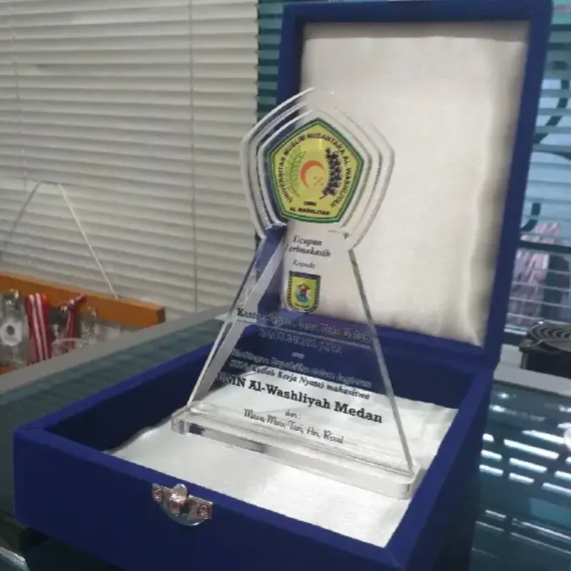 This elegant, custom-shaped acrylic plaque serves as a formal token of Gratitude and Thanks. It is presented by a group of students (Maza, Mina, Tari, Ari, Rizal) from UMN Al-Washliyah Medan to the Office of the Village Head of Kota Galuh, specifically acknowledging the support provided for a Student Community Service (BIMASURYA) activity. The design prominently features the university's official crest and the village's logo. This premium keepsake is beautifully displayed within a luxurious dark blue velvet box, ensuring an exclusive and professional presentation suitable for acknowledging community partnerships.